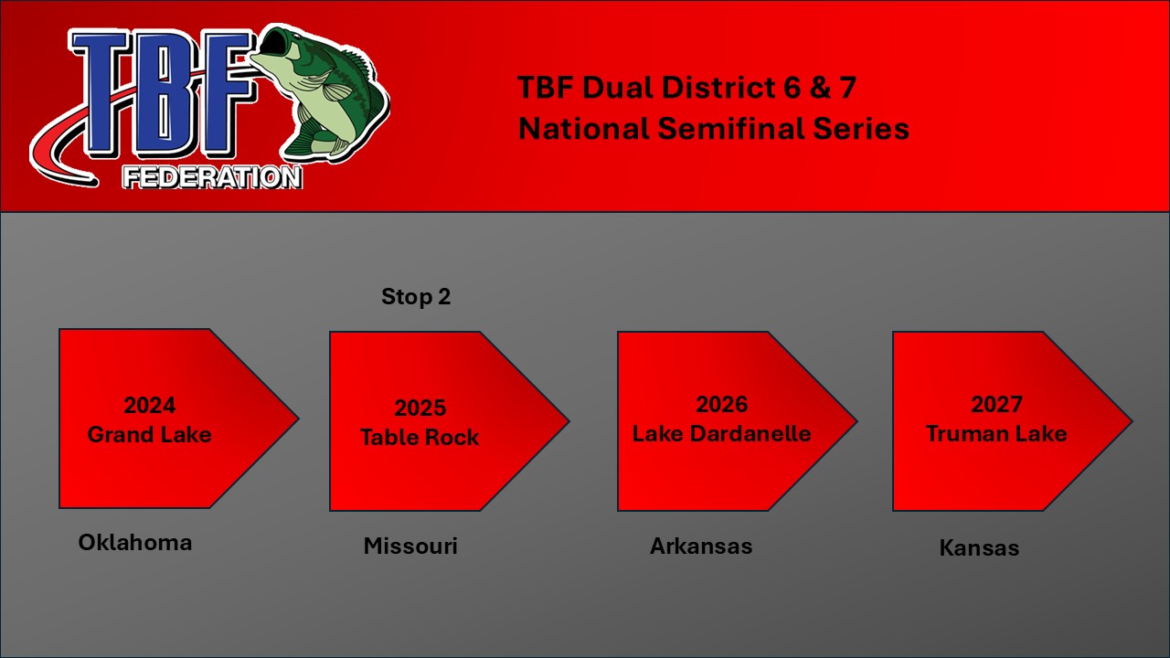 The 2026 TBF Dual District 6 & 7 National Semifinal will be held at Lake Dardanelle, Russellville, Arkansas.